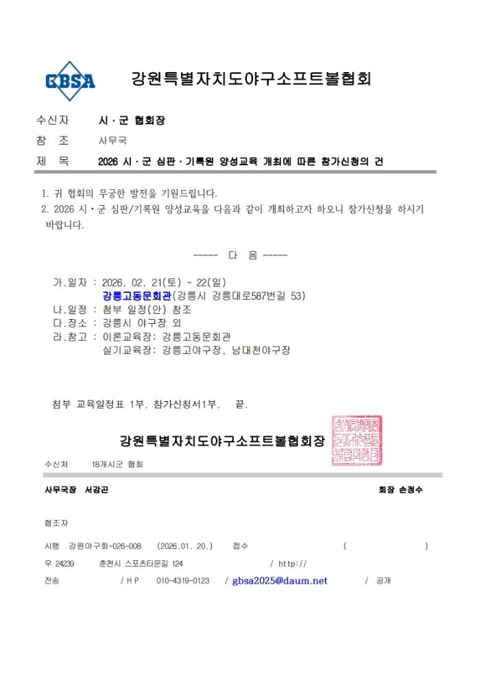 동해시야구협회 26년 심판 임명 건은 도 협회 심판 교육 수료자 및 시 협회 심판 교육을 이수 하신 분들로 임명 할 예정입니다. 도 협회 심판 교육 신청하실 분은 공문을 확인하시고 동해시 협회 전무이사께 신청하시길 바랍니다. 시 협회 심판 교육은 현재 동계 훈련 팀이 모든 구장을 사용 중이라 2월 중순 2주에 걸쳐 8시간 심판 교육을 진행할 계획입니다. 시 협회 관계자 분들과 협의 후 일정을 잡아 홈페이지에 공지 하겠습니다. |